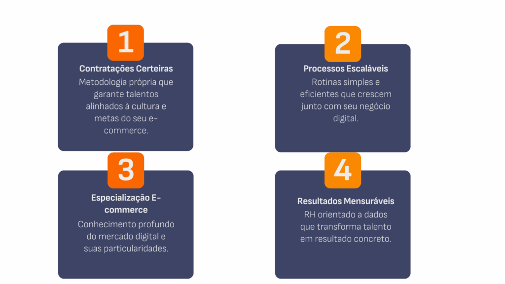 Somos o RH estratégico para quem vende online: headhunter e RH para e-commerce, feitos sob medida, no ritmo do digital. Unimos pessoas certas e processos que vendem para transformar talento em resultado, com contratações certeiras que fortalecem a operação e estratégia de pessoas para escalar seu e-commerce.